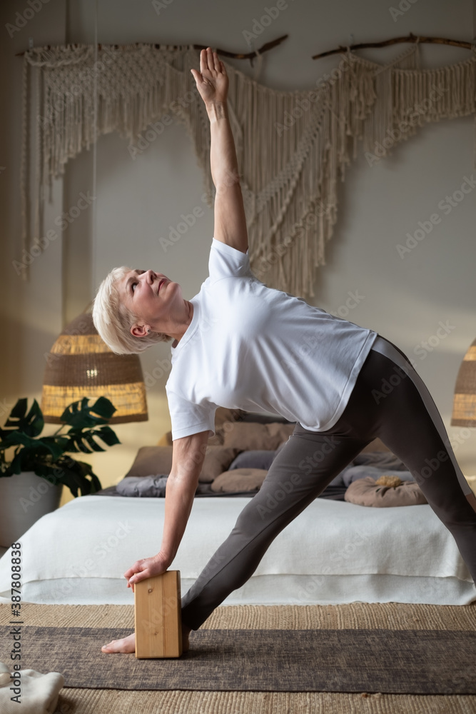 Senior woman practicing yoga, stretching in Utthita Trikonasana exercise, extended triangle pose