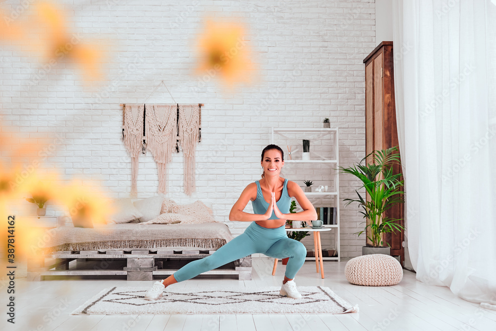 Sportive female athlete in blue sports bra and leggings doing side squat exercise at home.