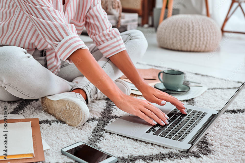 Close up view of female hands typing on modern laptop keyboard making notes writing on device.