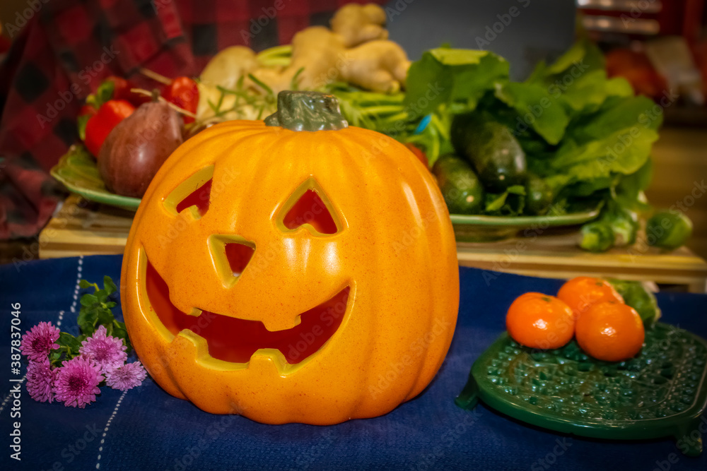 Happy Jackolatern sitting in front of a pile of beggies with flowers - bokeh background