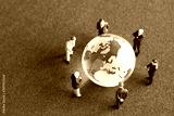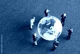 地球儀を見てミーティングをするビジネスマンのミニチュア