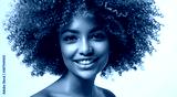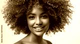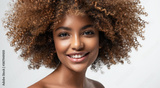 Beauty portrait of african american girl with clean healthy skin on beige background. Smiling dreamy beautiful black woman.Curly hair in afro style