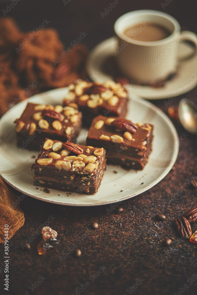 Chocolate cake with caramel frosting, pecans and hot coffee, on rustic background. Freshly baked