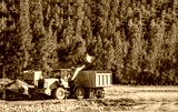 Bulldozer and dump truck work on the construction