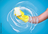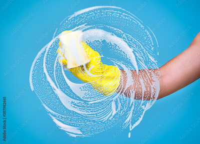Cleaning conept - hand cleaning glass window pane with detergent