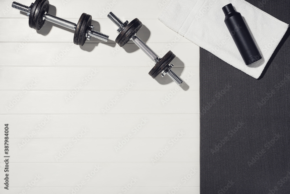 Sport equipment on white wooden background, training at home concept.