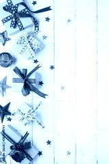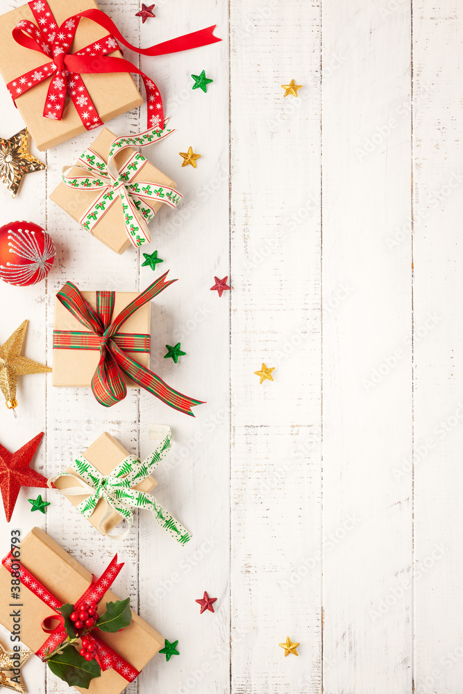 Christmas background with gift boxes and Christmas decorations and on white wooden background. Winter festive concept. Flat lay, copy space.