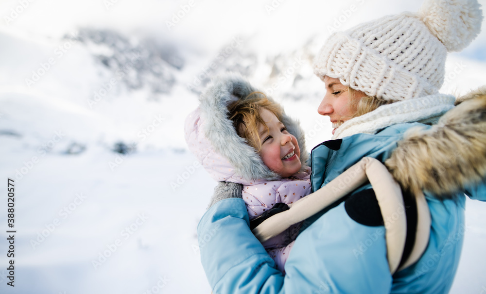 Mother with happy small daughter in carrier standing in winter nature, resting.