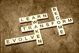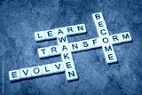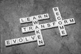 awaken, learn, evolve, transform and become crossword in ivory letter tiles against textured handmade paper, self improvement and personal development concept
