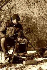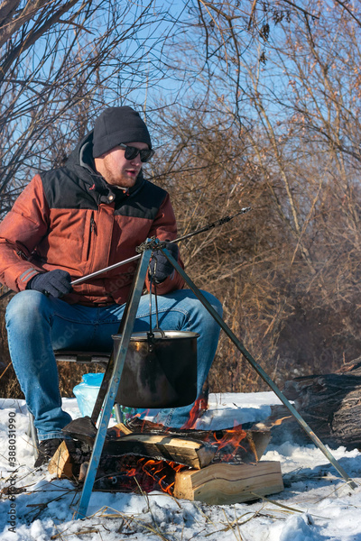 Male caucasian is sitting by campfire, pot of soot over bonfire hanging on tripod, winter outdoor cooking at campsite