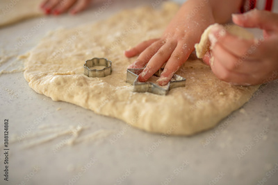 Close up of child playing with dough while preparing traditional Christmas cookies with cutters