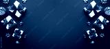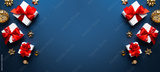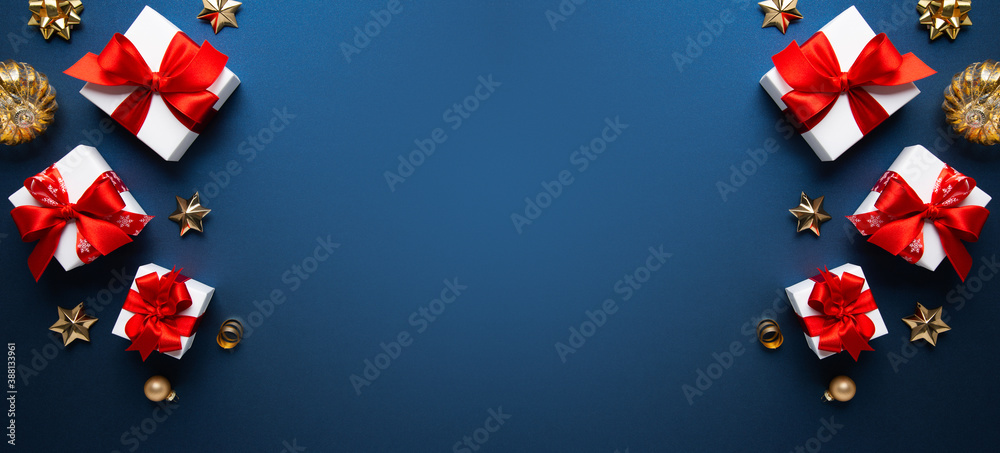 Merry Christmas and Happy Holidays greeting card, frame, banner. New Year. Noel. Christmas ornaments and gift on blue background top view. Winter xmas holiday theme. Flat lay