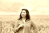 Beautiful young woman smelling a flower on a background of yellow field (wild mustard) at sunset. Relax and happy concept.