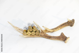 Pair of deer antlers, fox tail and bullets isolated on a white background
