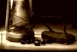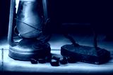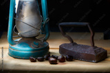 Old iron without cord and old kerosene lamp and chestnuts in a black background. A metal vintage iron that was warmed up on the stove or on the coals, and when it got hot, they ironed the clothes.