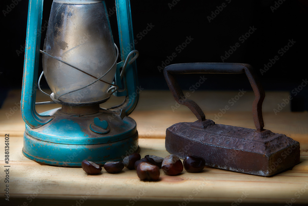 Old iron without cord and old kerosene lamp and chestnuts in a black background. A metal vintage iron that was warmed up on the stove or on the coals, and when it got hot, they ironed the clothes.