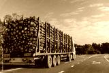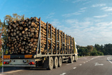 Long heavy industrial wood carrier cargo vessel truck trailer with big timber pine, spruce, cedar driving on highway road with blue sky background. Timber export and shipping concept
