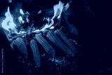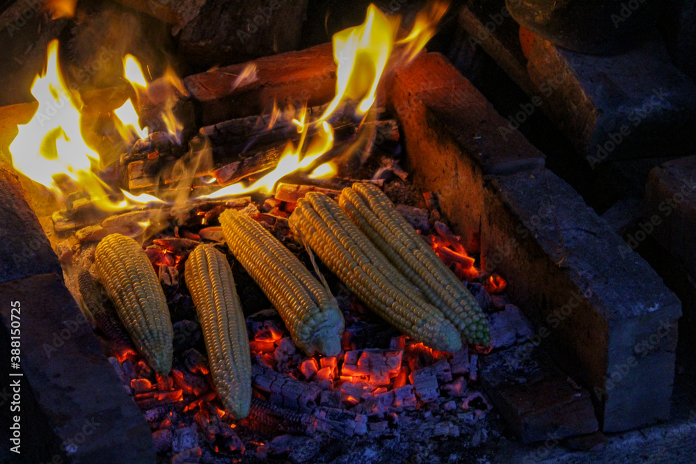 Five corns. Freshly harvested corn is grilled with a little fire and smoke in the background. Traditional way of roasting corn in Bosnia.