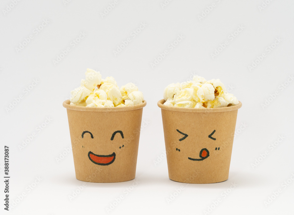 顔が描かれた紙コップにはいったポップコーン