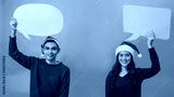 Young Asian couple lover wearing Santa Claus hat.Hand holding empty speech bubble paper isolated on blue background in studio shot.Christmas celebration of lover concept.