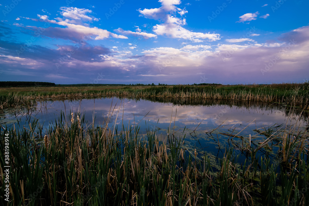 summer landscape with a pond in the field with a beautiful reflection of the sky in the water