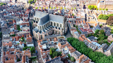 Aerial drone view of Leiden town cityscape from above, typical Dutch city skyline with canals and houses, Holland, Netherlands
