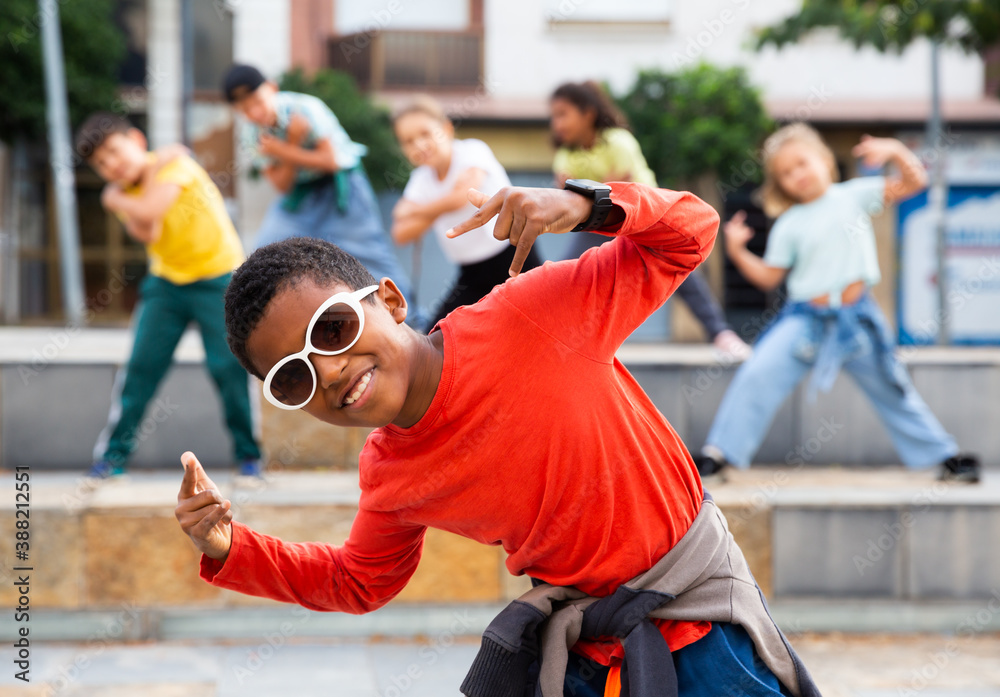 Portrait of preteen boy performing hip hop at outdoors group dance class