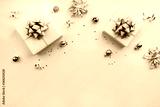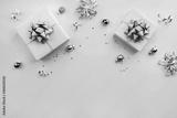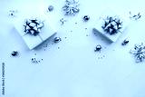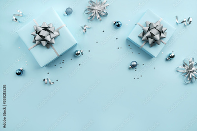 Christmas gift boxes with silver ribbons, decoration, bows, sparkles and confetti on bluebackground. Xmas and New Year greeting card, winter holiday. Flat lay, top view, frame