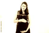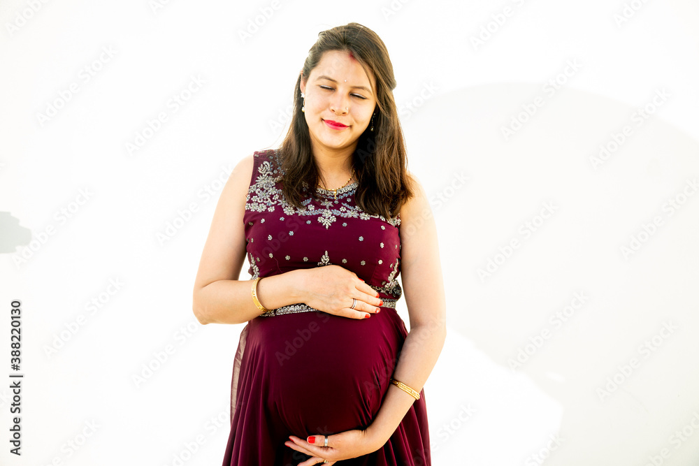 Young pregnant woman looking at belly standing against white background outdoor studio shot, happy female expecting baby, motherhood and pregnancy concept, copy space.