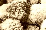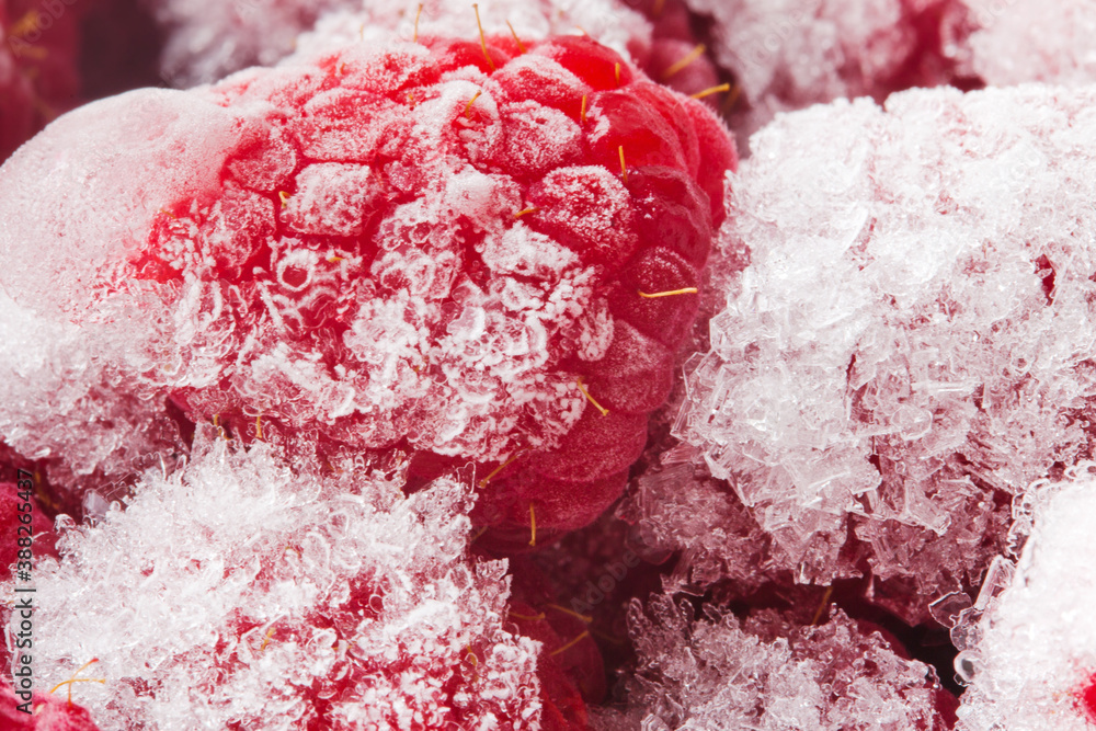 Macro view ripe red raspberries covered with frost and snowflakes. Shallow depth of field