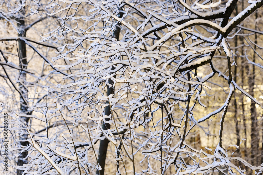 Fairytale winter park nature after snowfall. The branches of a trees covered with snow.