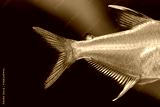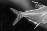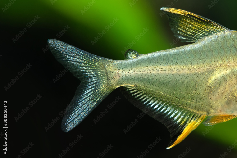 Сlose-up of tail and fins of aquarium fish the Lemon tetra Hyphessobrycon pulchripinnis. Freshwater tank exotic fish translucent yellow, pearlescent lustre colors body. Shallow depth of field.