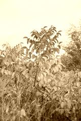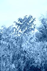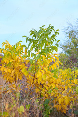 Creative autumn background of pine sapling leaves. Seasonal concept. Red, yellow, green, orange leaves of barberry in autumn. Colorful autumnal plants.