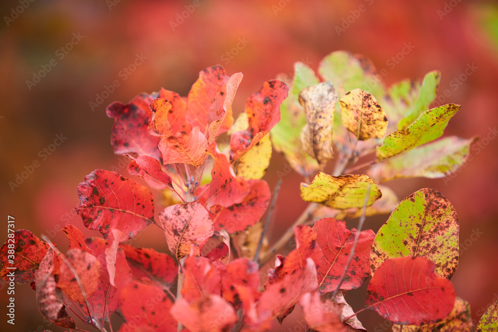 Creative autumn background of pine sapling leaves. Seasonal concept. Red, yellow, green, orange leaves of barberry in autumn. Colorful autumnal plants.
