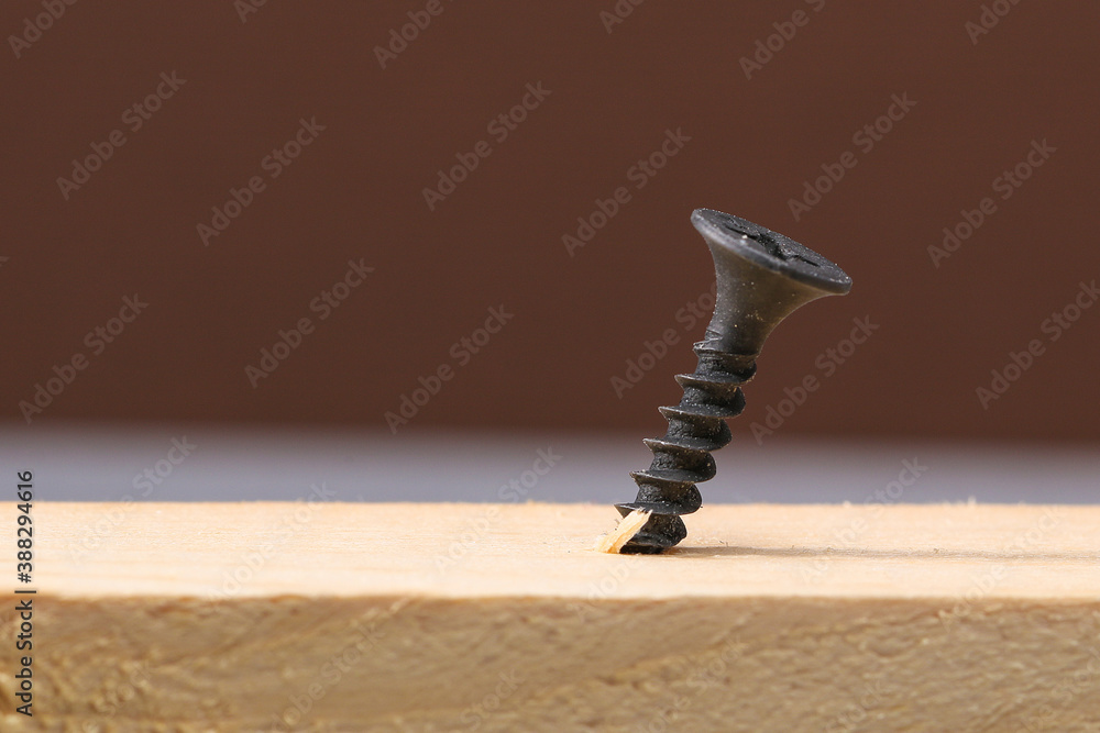 Black iron screws screwed into wood with screwdriver. Fasteners and hardware.
