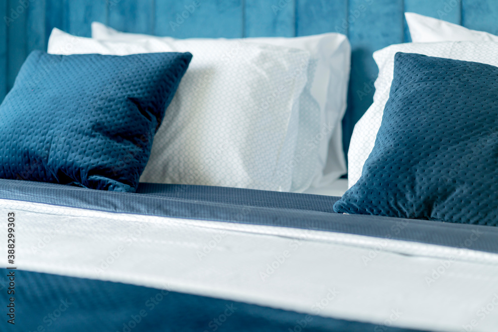 close up white beige soft pillows on bed and blanket bedroom interior design concept.bed maid luxury ideas concept