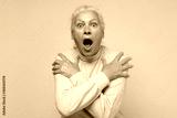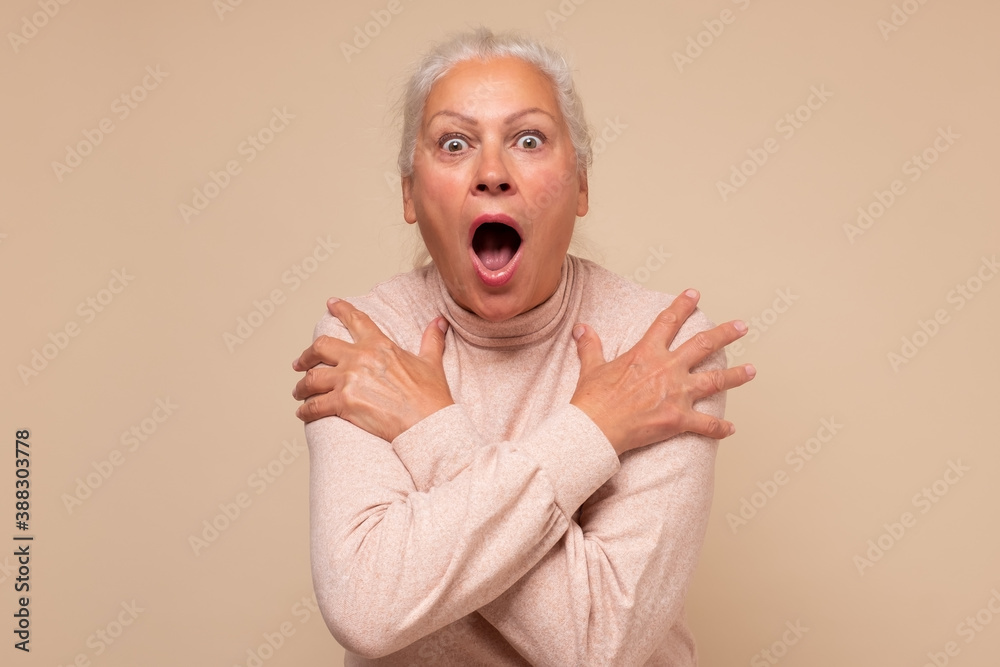 Frightened elderly woman looking surprised and shocked.