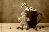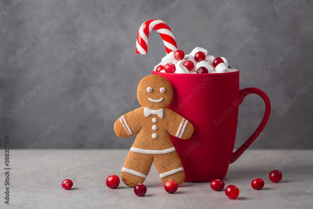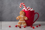 Gingerbread man with a red cup with marshmellow and cranberries. Christmas concept. Minimalistic image. Copy space.