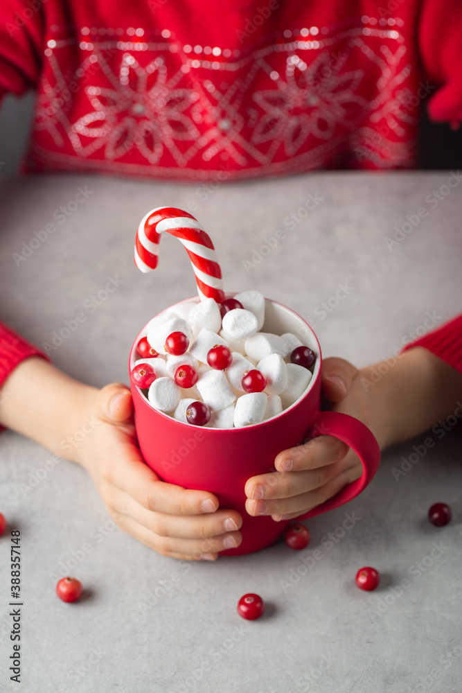 Girls’ hands holding a cup of beverage decorated with marshmallow and cranberries. Christmas time.