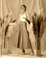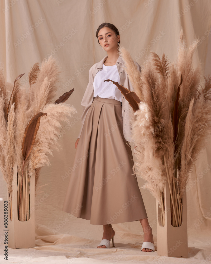 Young elegant female model standing on beige textile background and posing between ears of rye. Brunette girl with makeup and pony tail hair in white shirt and beige skirt and jacket