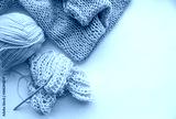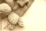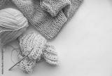 A ball of woolen thread with knitting needles and an English knitting pattern lie on a white background by the window