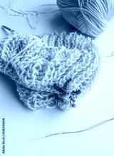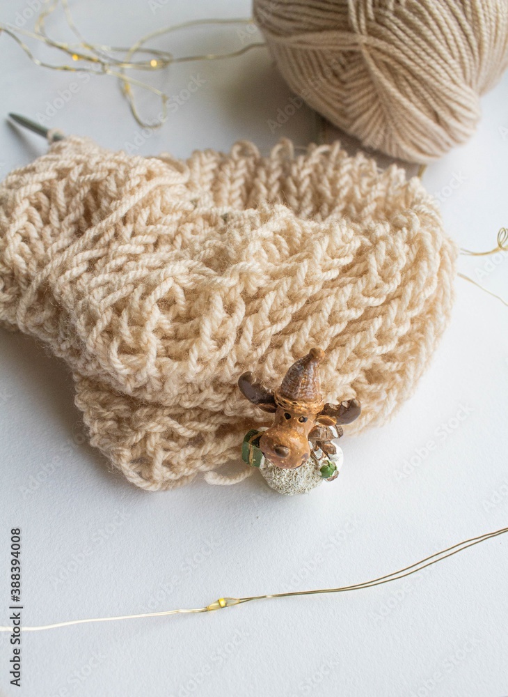 A ball of woolen thread with knitting needles and an English knitting pattern lie on a white background by the window with a small toy fawn