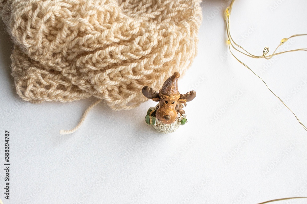 A ball of woolen thread with knitting needles and an English knitting pattern lie on a white background by the window with a small toy fawn