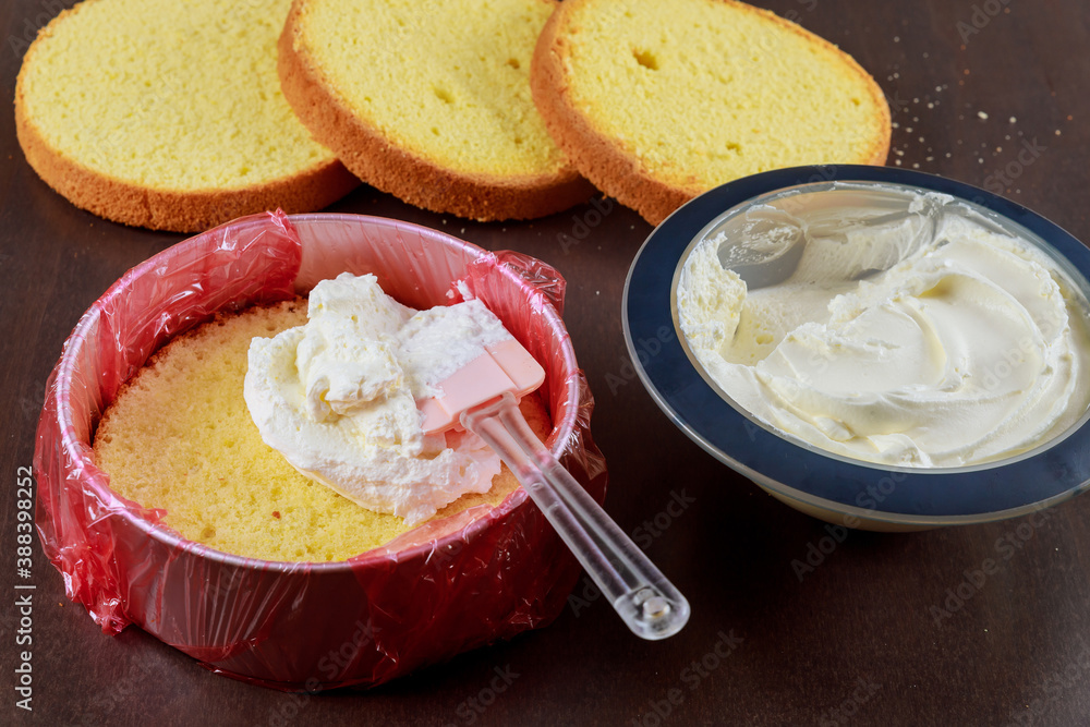 Cake assembly. layer cake with icing.