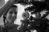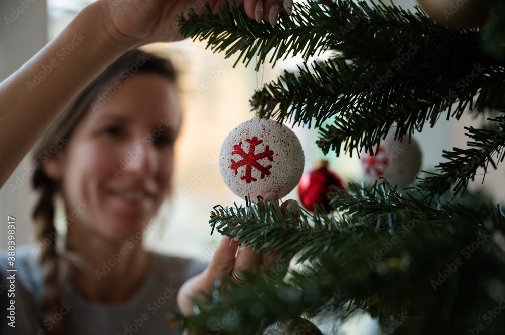 Hanging red and white holiday bauble on a christmas tree