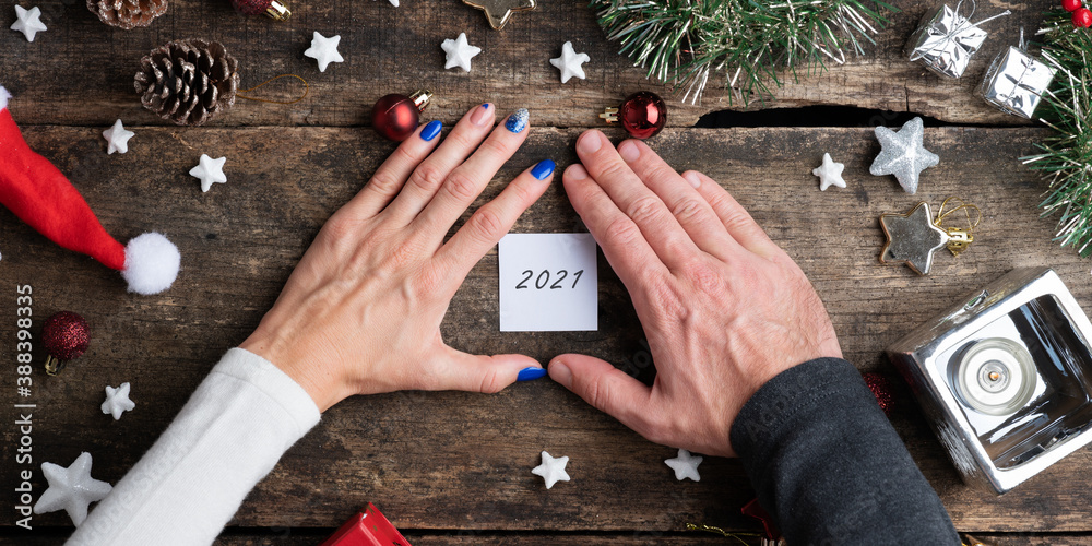 2021 sign on wooden desk full of holiday ornaments