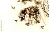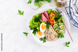 Breakfast oatmeal porridge with boiled egg, ham and vegetables salad. Healthy food. Top view, overhead, copy space