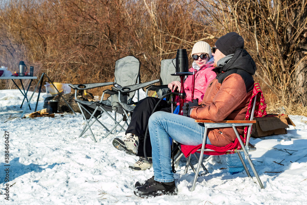 Young couple resting on camping chairs, smoking hookah outdoors in campside at sunny day, winter relax in wild