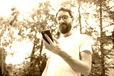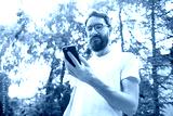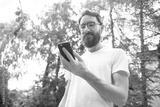 Young smiling bearded man standing outdoor with a mobile phone in his hand. Receiving a message on a cell phone, smartphone.