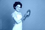 Profile side view portrait of her she nice attractive pretty cheerful cheery maid wearing curlers wiping washing plate cleanliness detergent after party isolated over green color background
